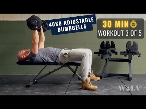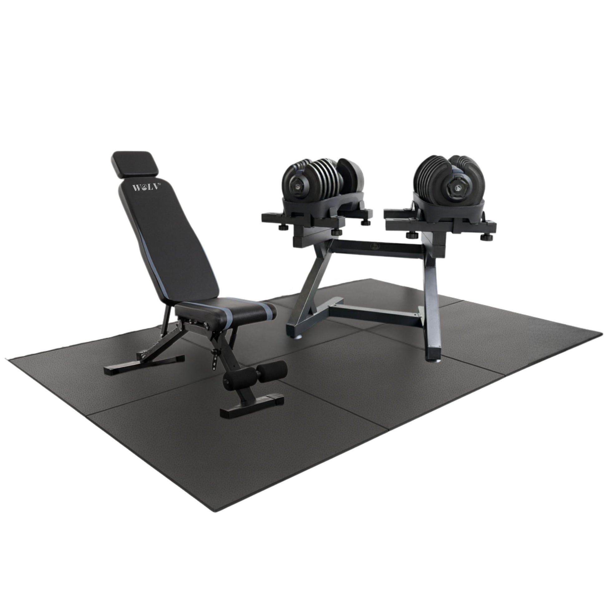 Train met twee 40 KG WOLV Verstelbare Dumbbells, de Bastion Bank, Lift Rack en hoog-densiteit rubberen tegels (2 cm dik) die je vloer beschermen en je trainingsstation stevig op zijn plek houden.